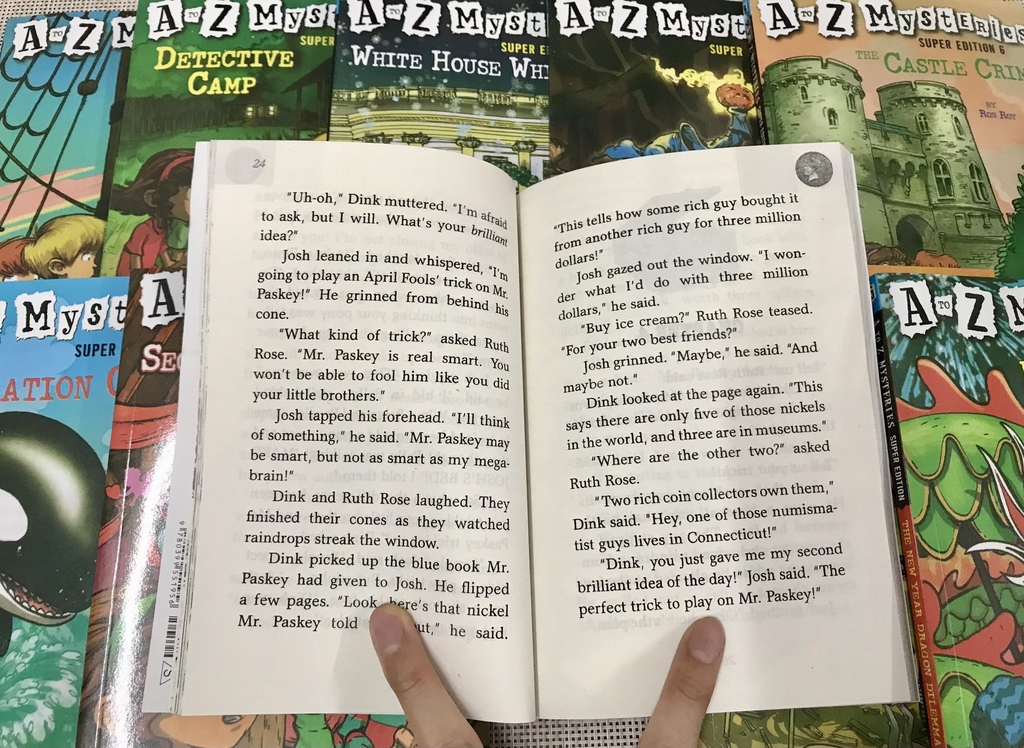 《 A TO Z MYSTERIES SUPER EDITION》- 14 CUỐN Phiên bản mới SUPER EDITION siêu "bánh cuốn"!!! Ba đứa trẻ gặp phải nhiều vụ án khác nhau, sử dụng những manh mối, suy nghĩ thấu đáo để điều tra, suy luận và cuối cùng bắt được tên tội phạm. Số trang mỗi cuốn khoảng 90 trang, từ vựng và độ khó đều tăng so với Junie B. Jones, cách sắp chữ mỗi trang nhiều hơn Junie B. Jones vài dòng. ❗❗❗ Câu chuyện thú vị và hồi hộp, từ ngữ dễ hiểu và cốt truyện súc tích